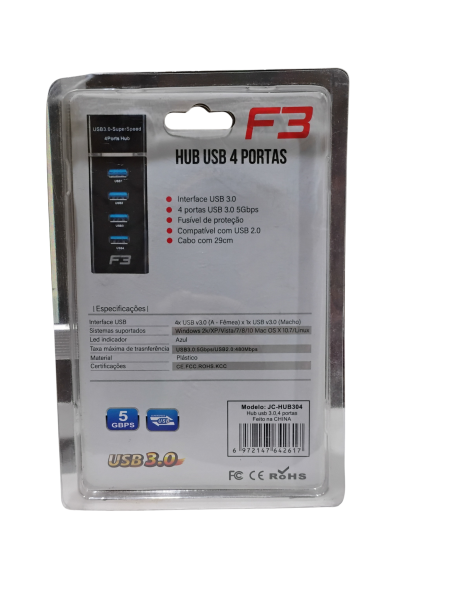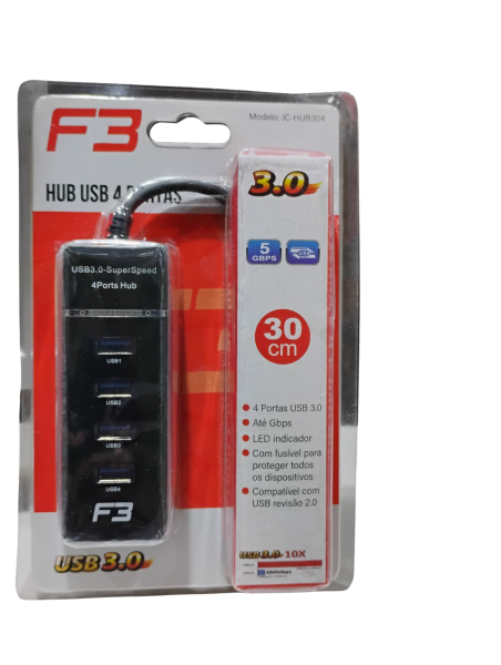 O HUB USB 3.0 4 Portas F3 expande suas conexões USB com quatro portas rápidas e confiáveis. Ideal para conectar pendrives, HDs externos, mouses, teclados e outros dispositivos, garantindo transferência de dados até 5 Gbps. Compacto e com cabo de 30 cm, é perfeito para mesas de trabalho e notebooks.